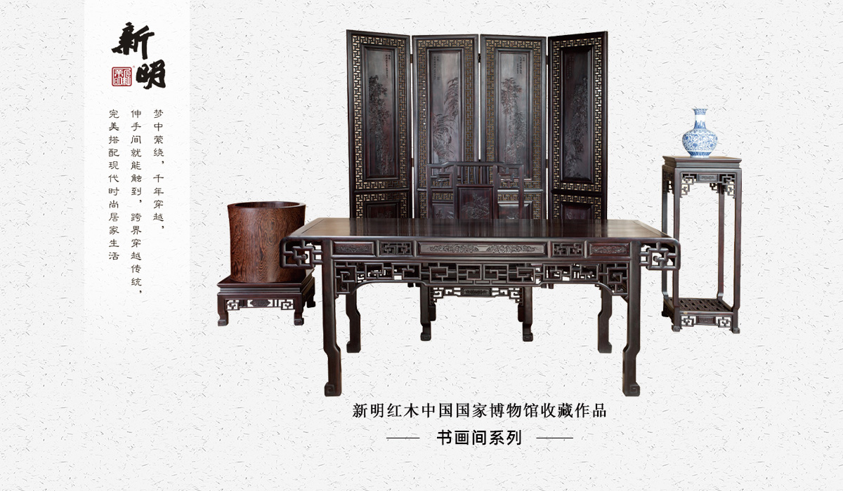 東陽市新明紅木家具有限公司由創始人中國傳統工藝大師張新民先生在1995年2月創建于擁有“百工之鄉”、“木雕之鄉”的浙江省東陽市橫店鎮,是一家集研發、設計、生產、銷售于一體的國內大型專業生產紅木家具的綜合型企業。經過30年的持續發展,到今天已經成為目前國內紅木行業規模很大的企業之一。公司占地面積70畝,擁有生產車間面積12萬多平方米,展館面積1.5萬多平方米,行政、辦公、會議、倉儲面積2.8萬多平方米。公司目前設有6個藝術展館;①號為大紅酸枝博覽館,②十里紅妝古典藝術館,③墨語新美學家居館,④號為中式全屋整裝館,⑤號為新中式家居館,⑥號新品發布館。3000余平方的國際會議中心,將可同時容納全國二百家多家專賣店學習、培訓、會議。員工總人數達500余名,產值3.8億。